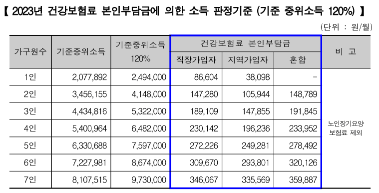 ✔ 아래의 5가지 기준을 모두 충족해야 하며 가구소득은 건강보험료 부과금액으로 확인하고 가구원 중위소득 산정은 주민등록등본 상 가구원 수에 포함되는 가구원 중 건강보험료를 납부하는 모든 사람의 보험료를 합산한 것입니다. 신청인이 건강보험 상 피부양자(건강보험 상 부모 등의 세대원으로 등록)인 경우 주민등록이 별도 분리되어 있어도 부양자 부과액 기준이 적용됩니다.