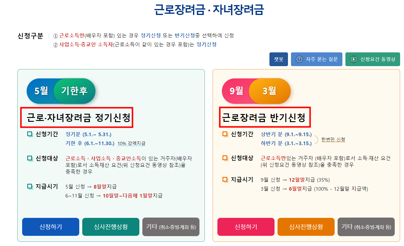 정기신청 기간은 2023년 5월 1일(월) ~ 5월 31일(수)까지이며 지급은 8월 말 예정입니다. 기한 후 신청 기간은 2023년 6월 1일(목) ~ 11월 30일(목)까지이며 산정된 장려금의 90%만 지급되므로 5월 중 신청을 권장합니다. 반드시 본인 명의의 계좌번호, 전화번호를 입력해야 장려금을 빠르고 편리하게 받을 수 있으며 본인이나 배우자가 종합소득세 확정신고 의무가 있는 경우에는 반드시 확정신고를 해야 근로·자녀장려금을 받을 수 있다고 하니 꼭 확인하시기 바랍니다.